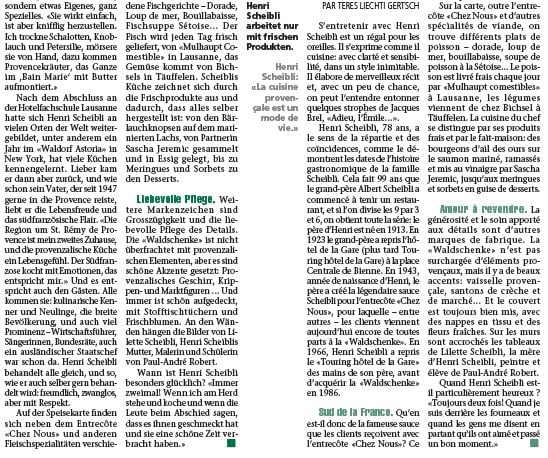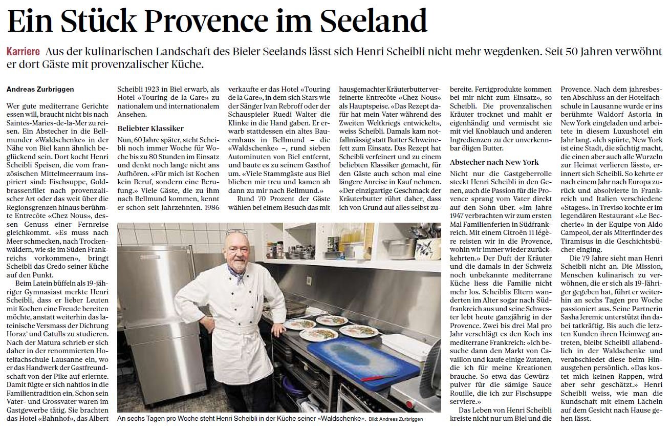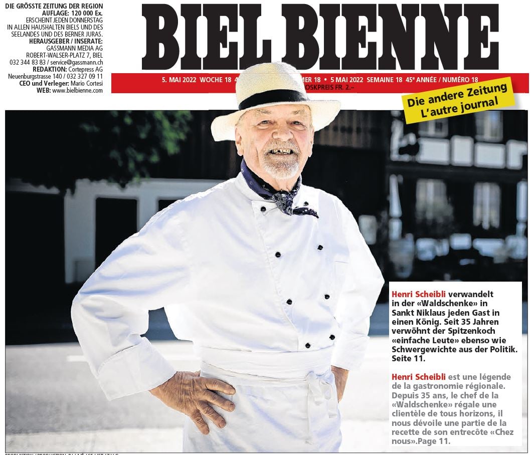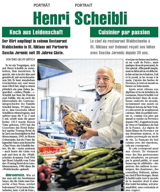 Über 100 Jahre ist es her, dass Grossvater Albert Scheibli im Hotel "Touring de la Gare" in Biel zu wirten begann. Vor 80 Jahren erfand er das legendäre "Entrecôte Chez Nous", das bis heute praktisch unverändert unser Markenzeichen geblieben ist. Vor fast 60 Jahren übernahm Henri Scheibli das "Touring de la Gare" und vor fast 40 Jahren die Waldschenke. Hier zelebrieren er und Geschäftsführerin Sascha Jeremic bis heute die provenzalisch-französische Küche, den Genuss und das mediterrane Lebensgefühl. Das Wichtigste dabei bleibt Qualität und Tradition: alles ist hausgemacht, immer frisch und mit saisonalen und regionalen Zutaten zubereitet.